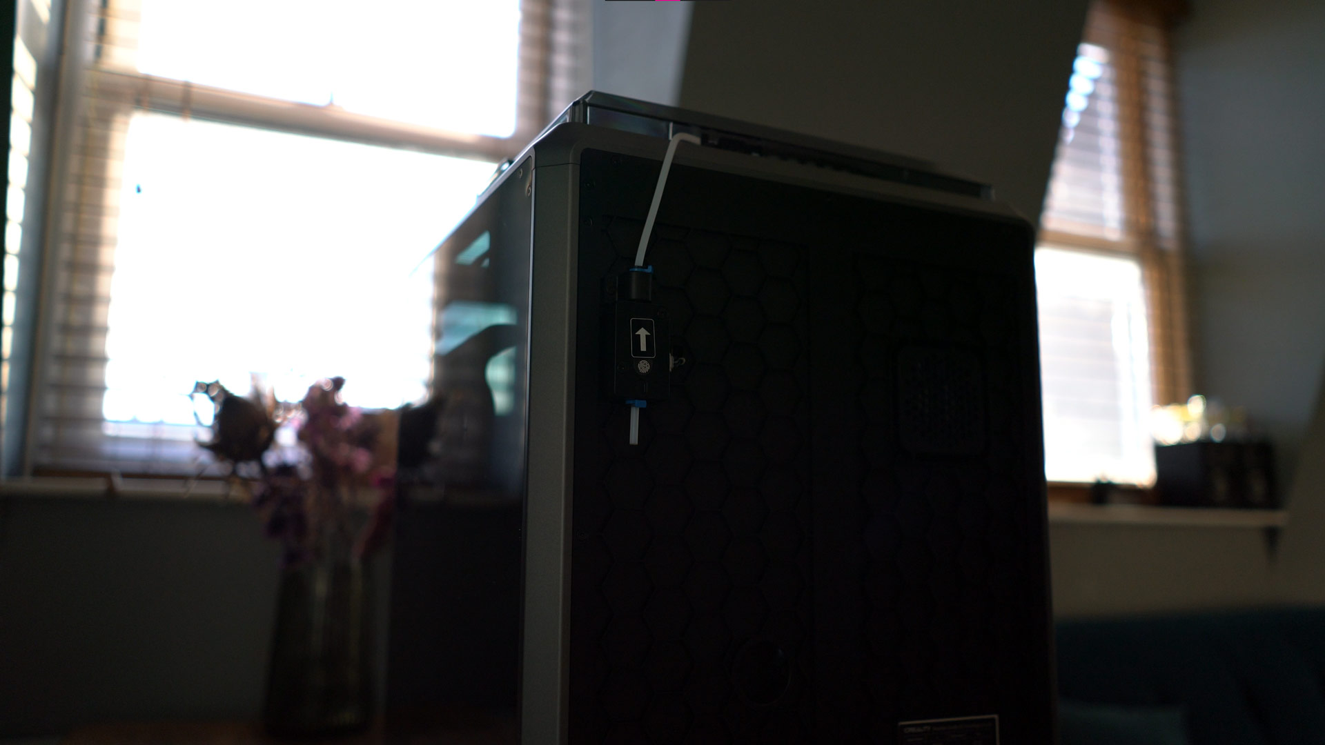 Also at the back of the K1 is the filament reel and power button, which is more troublesome to reach than the holder atop the rail of my Prusa MK3S+. With that said, I typically feed directly from a Sunlu S2 filament dryer.