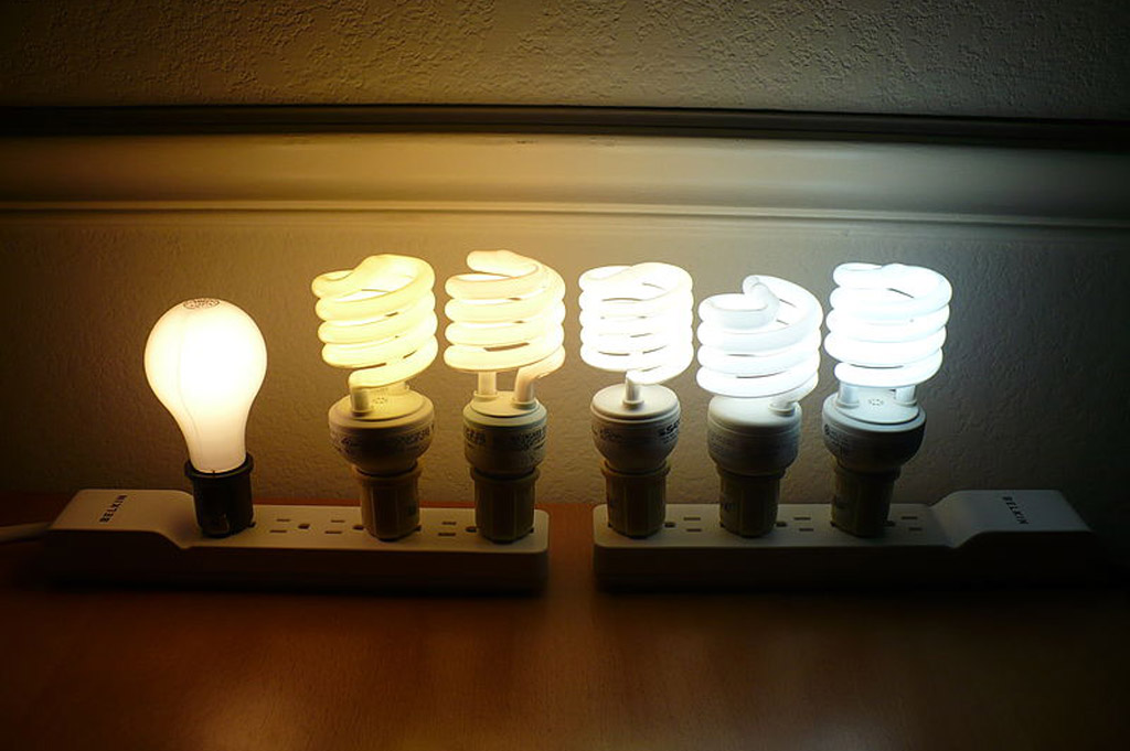 Left to right: 100 watt incandescent, 2700K, 3500K, 4100K, 5500K and 6500K CFL