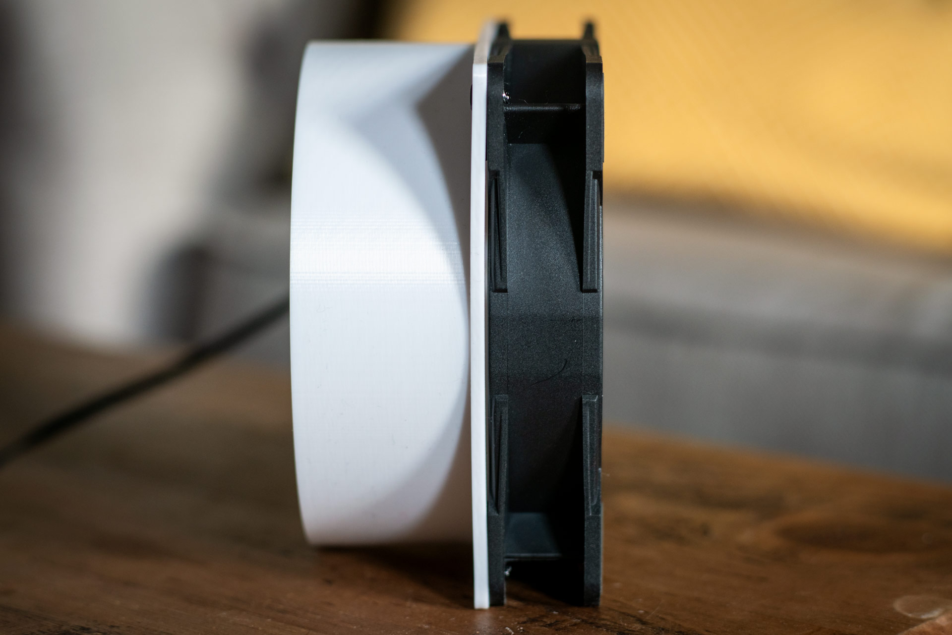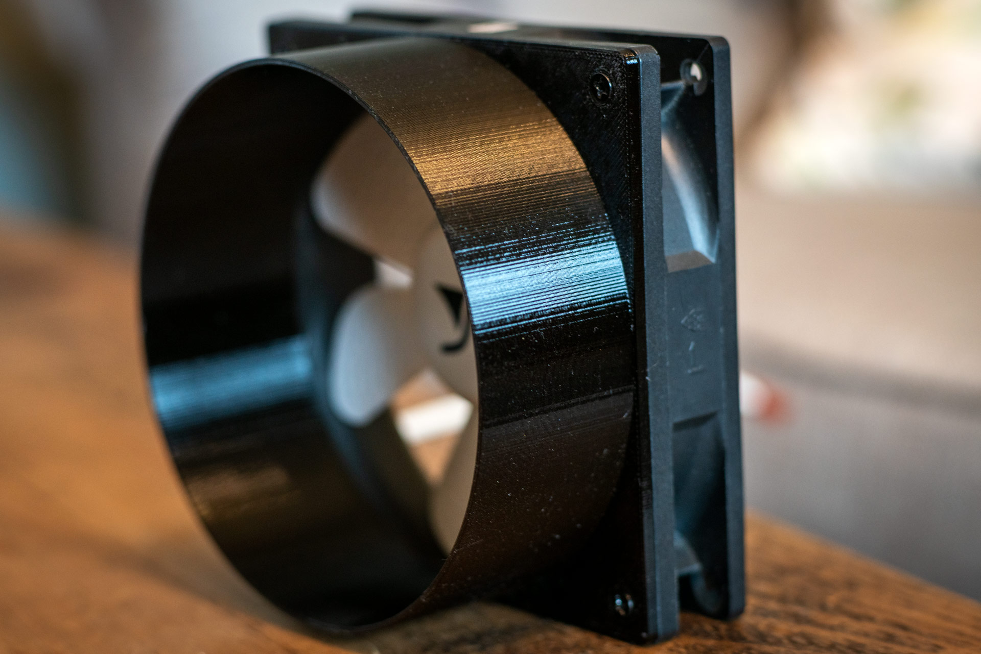 That is why I designed a fan shroud (available in black, white or custom colours) that bridges the gap between the main chamber intake and outside of the case while concentrating airflow.
