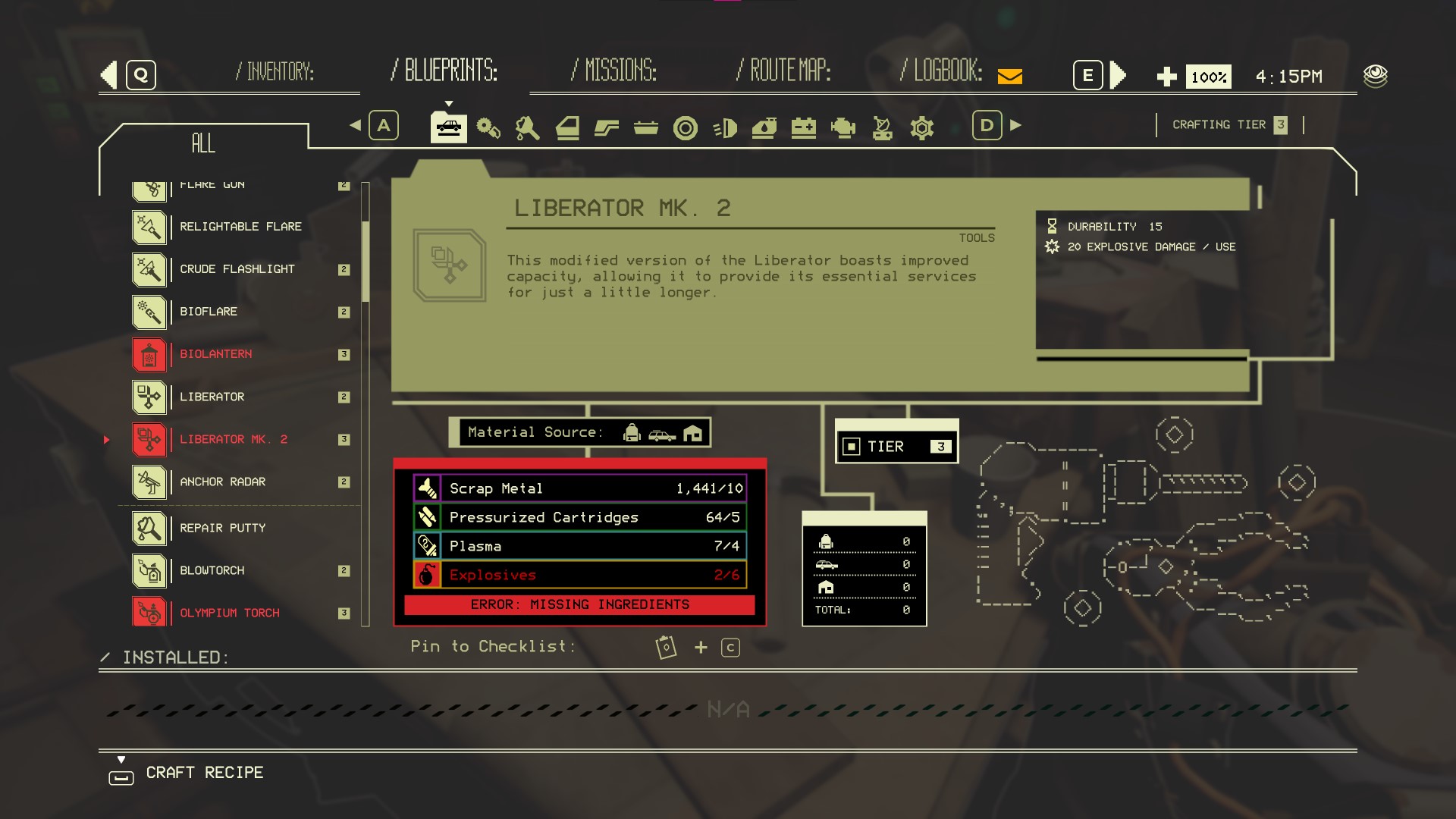 Materials needed: 20 x Tree Candy, 4 x Glass Shards, 40 x Plastic, 2 x Circuit Board