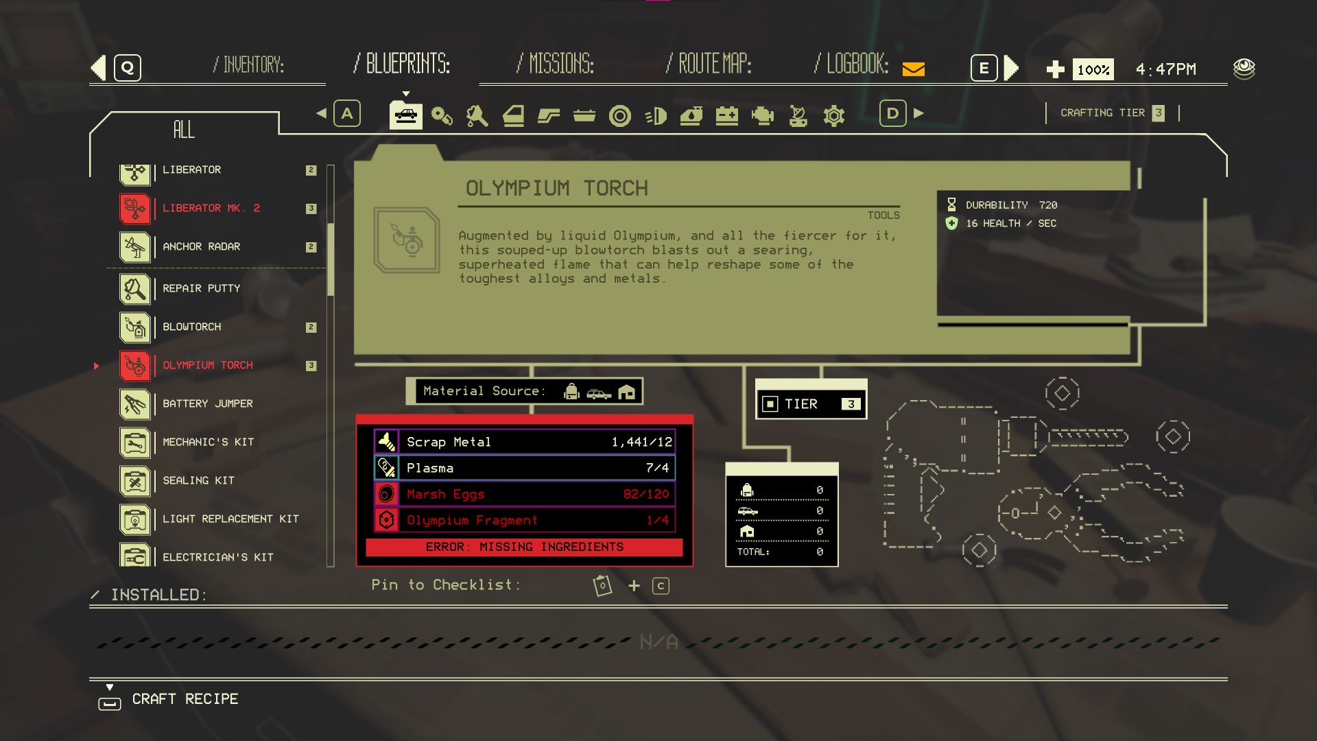 Material cost: 12 x Scrap Metal, 4 x Plasma, 120 x Marsh Eggs, 4 x Olympium Fragment