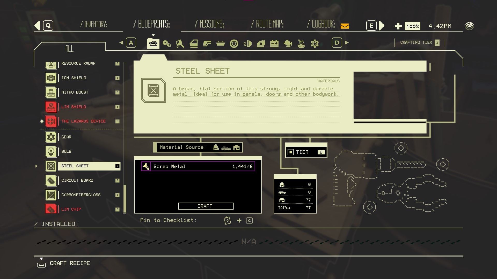 Not the most exciting start, admittedly. Steel Sheets are, however, absolutely worth unlocking because they form the basis of hardy Steel Bumpers, Steel Doors and Steel Panels (once also unlocked in the Fabristation).