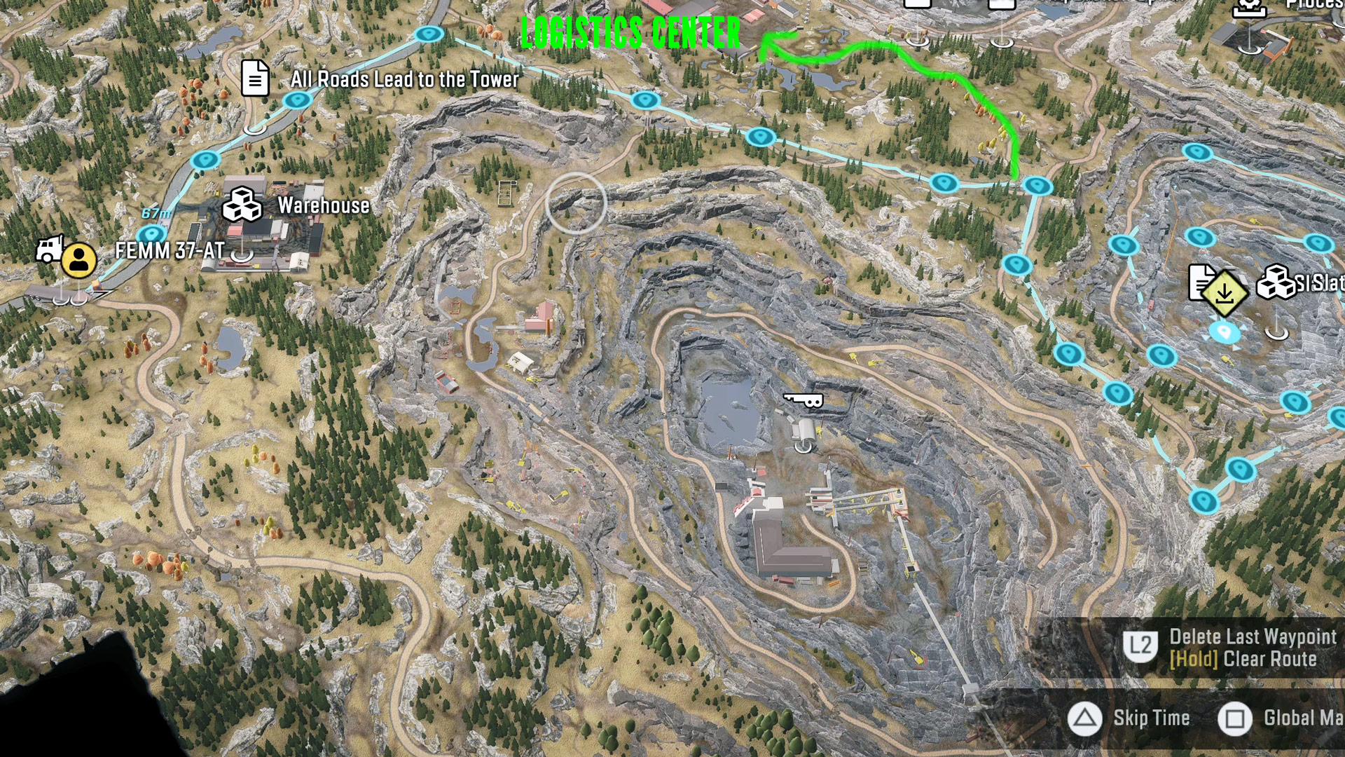 When you have the trailer and PLAD 450 reunited or just the latter to deliver, you can go the long way round or take a shortcut through the swamp to the Logistics Center. Drive the truck and trailer into their respective yellow boxes.