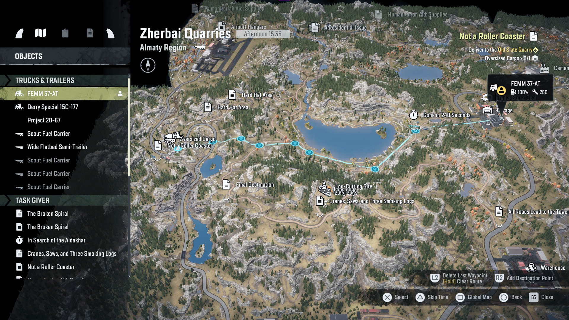 The return route is basically a horseshoe on tarmac roads with an easy-to-avoid blockade in the town. Get to the Oversized Cargo marker on the map in the west then separate the PLAD 450 from the trailer and cargo. Use a crane to reload the storage container on the trailer if it has fallen off or load it onto your own trailer or truck.