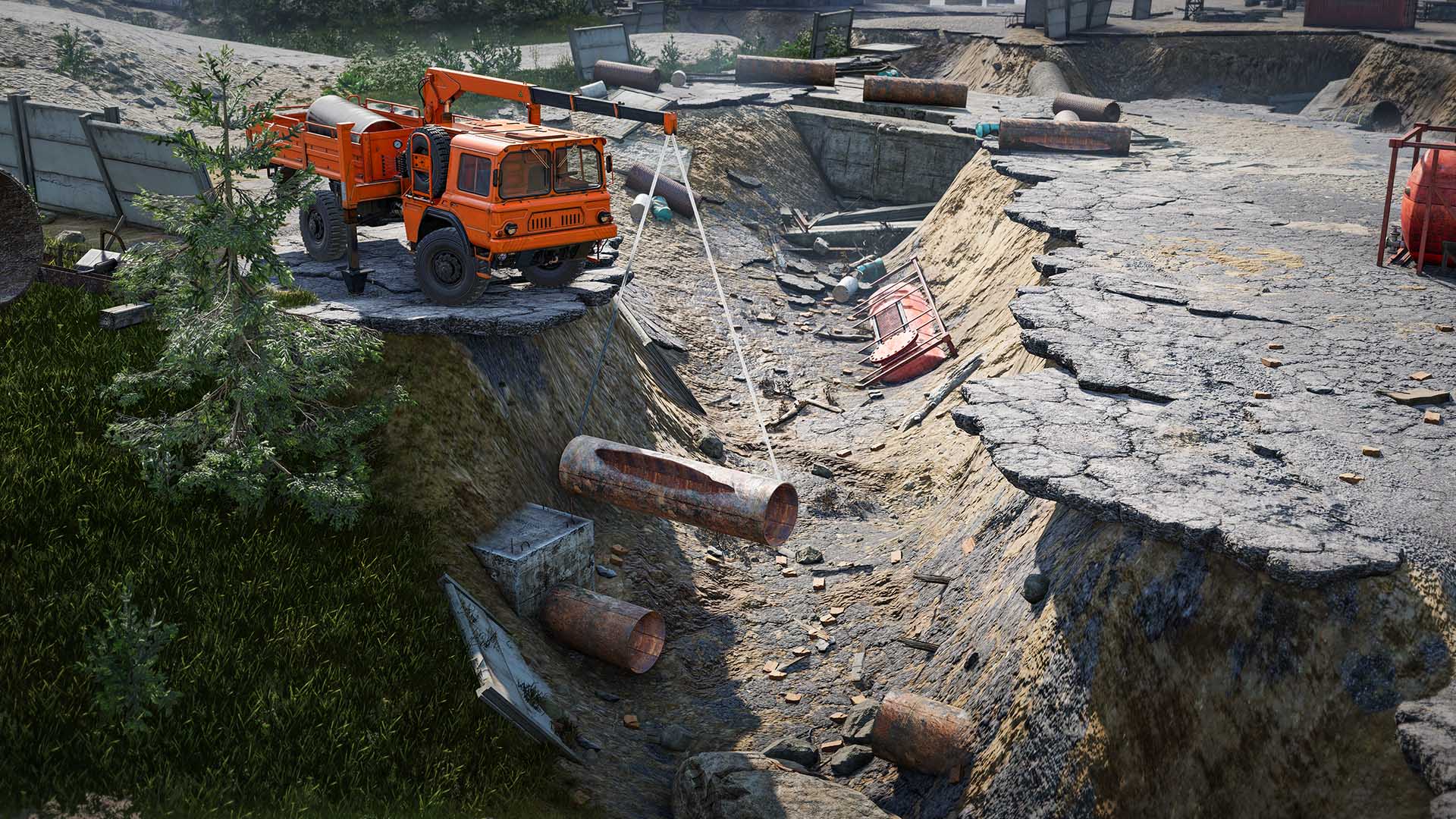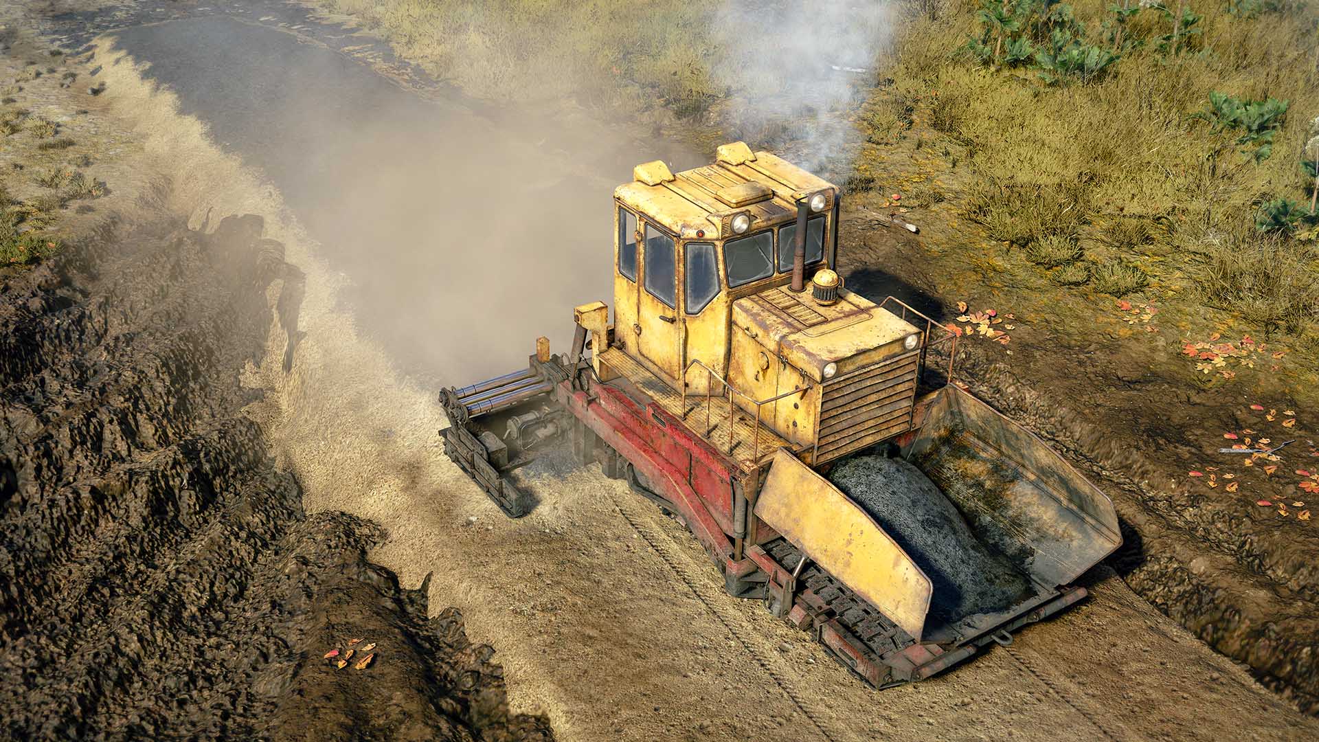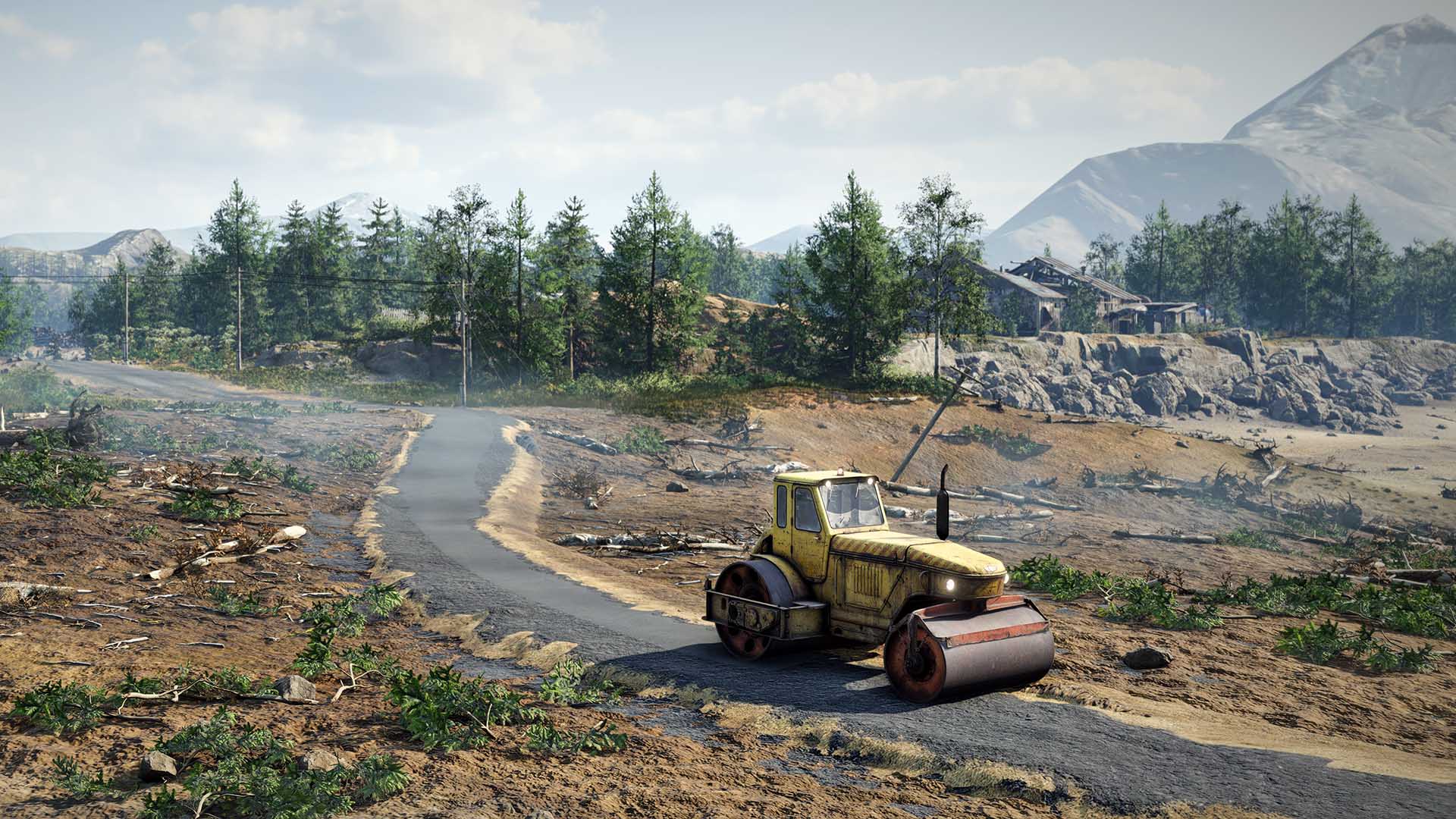 The RoadCraft world is certainly more in-depth than its peers. For example, tree stumps are not just impassable nightmare fuel objects, they can be mulched or pushed over if the vehicle is big enough. Or have their roots dug out the ground by a bulldozer. Tracked vehicles are a thing too. Finally.