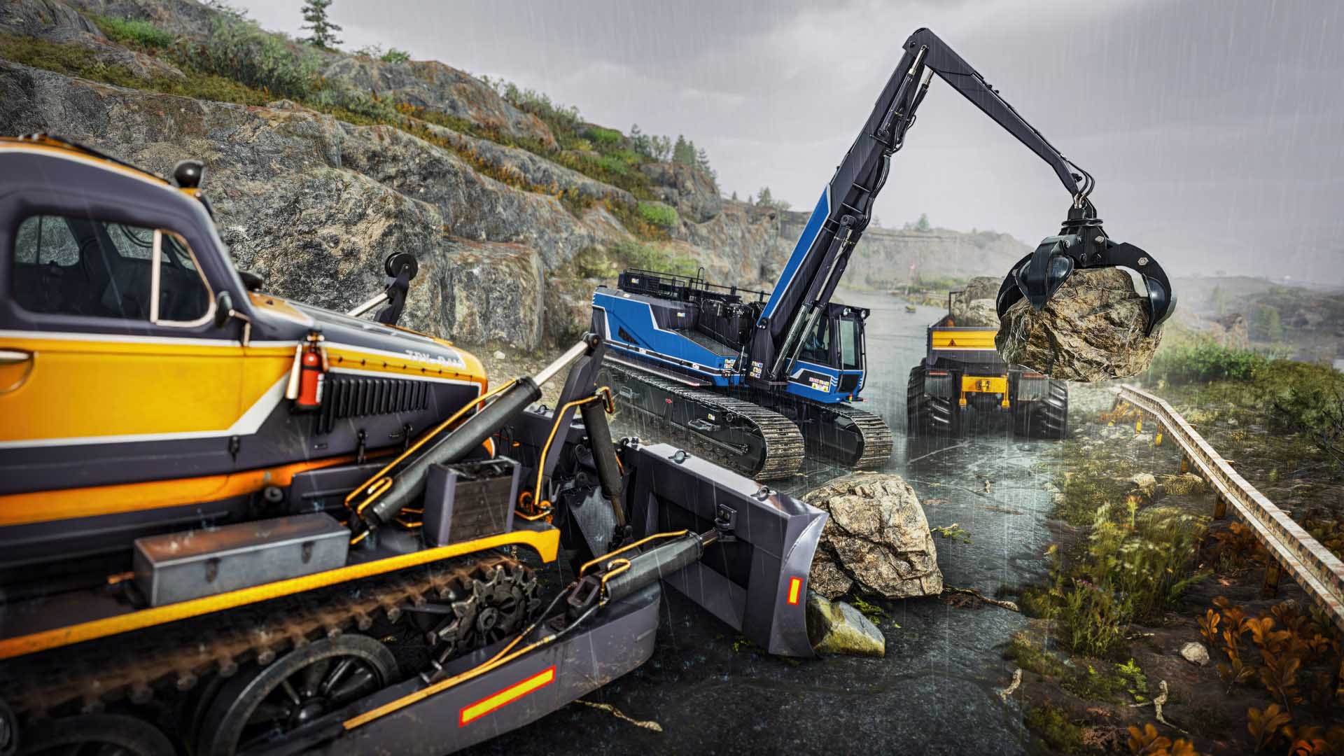 You can expect three biomes – desert, highland, and forest and mountain – that span 28 square kilometres. That is 17.4 square miles of muddy, rocky, sandy, watery, untidy and tippy terrain. All for £35 or equivalent for the standard RoadCraft version. Pre-order for the highly useful Aramatsu Bowhead 30T sand-slinger.