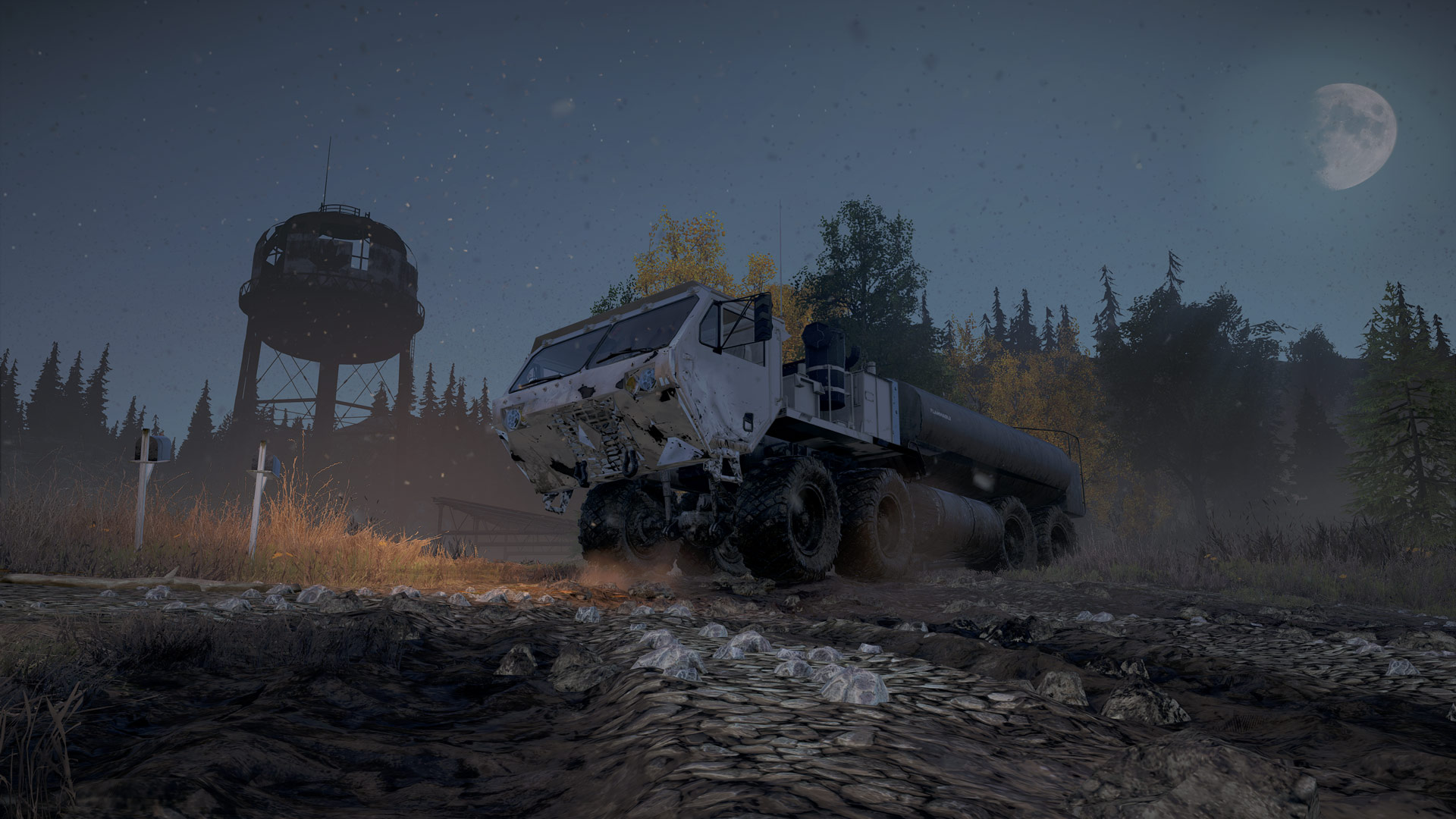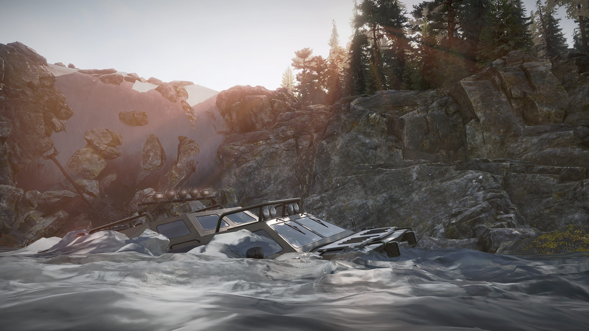 Think narrow and winding ascents and descents over mountains, empty and embering woods and stunning water crossings that surround each large expanse of land. It feels like various SnowRunner maps combined yet there is nothing quite like those colourless dead woods.