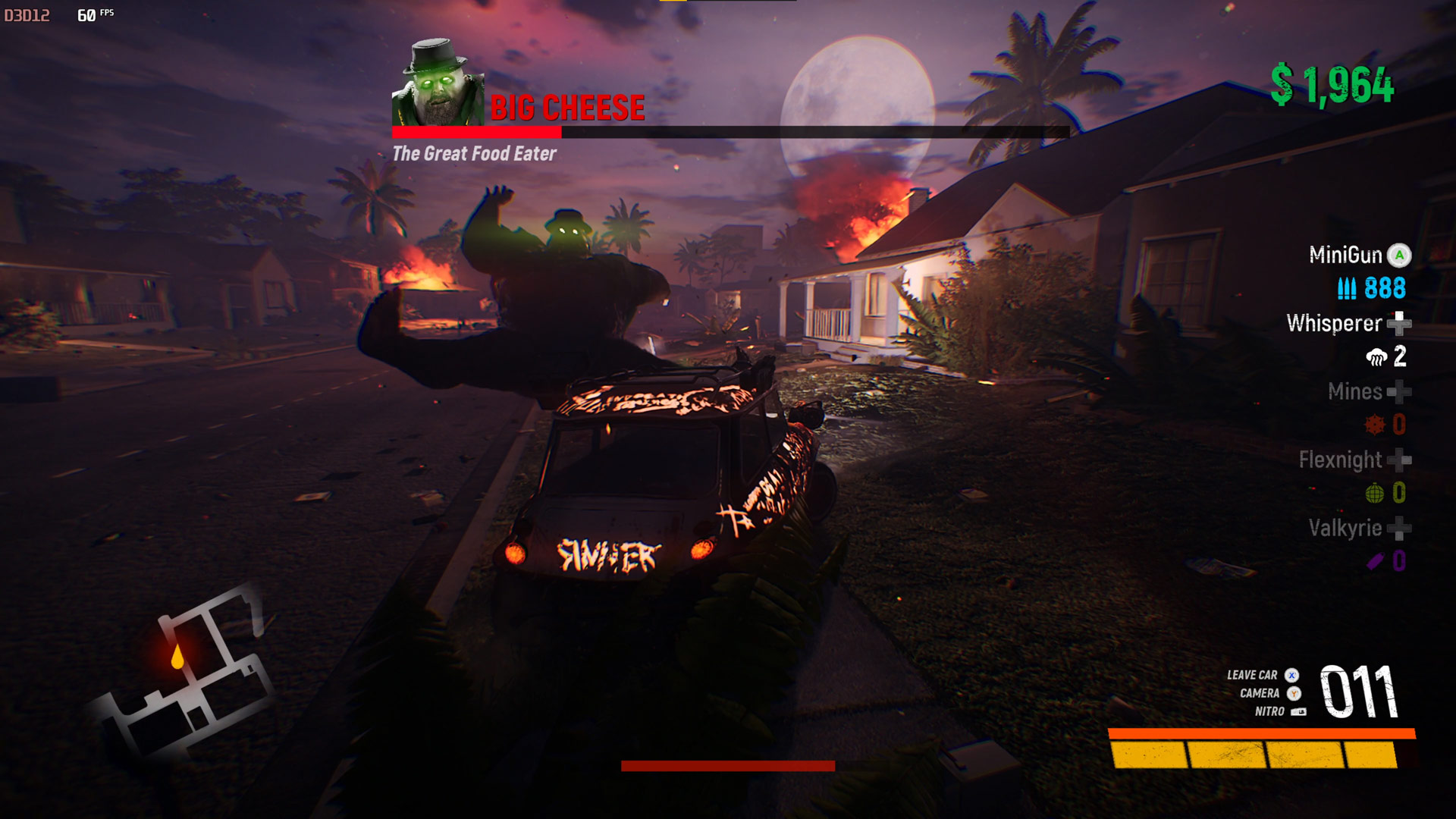 Big Cheese really lives up to half his name in the Trail Out Halloween special as he is the size of a house and wants to sit on your face. Fortunately, he is pretty slow and minigun damage slows him down. Run away, handbrake round and then shoot. Rinse and repeat.
