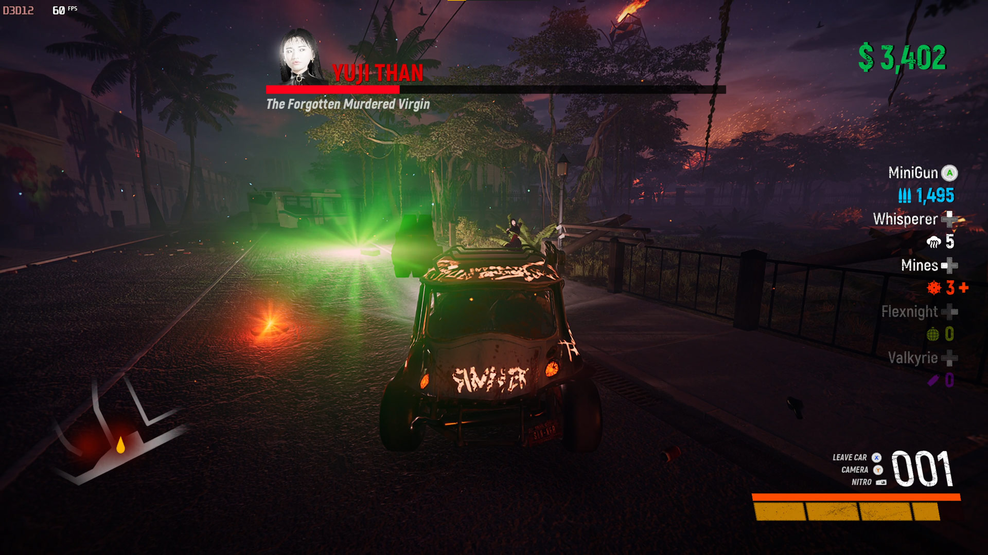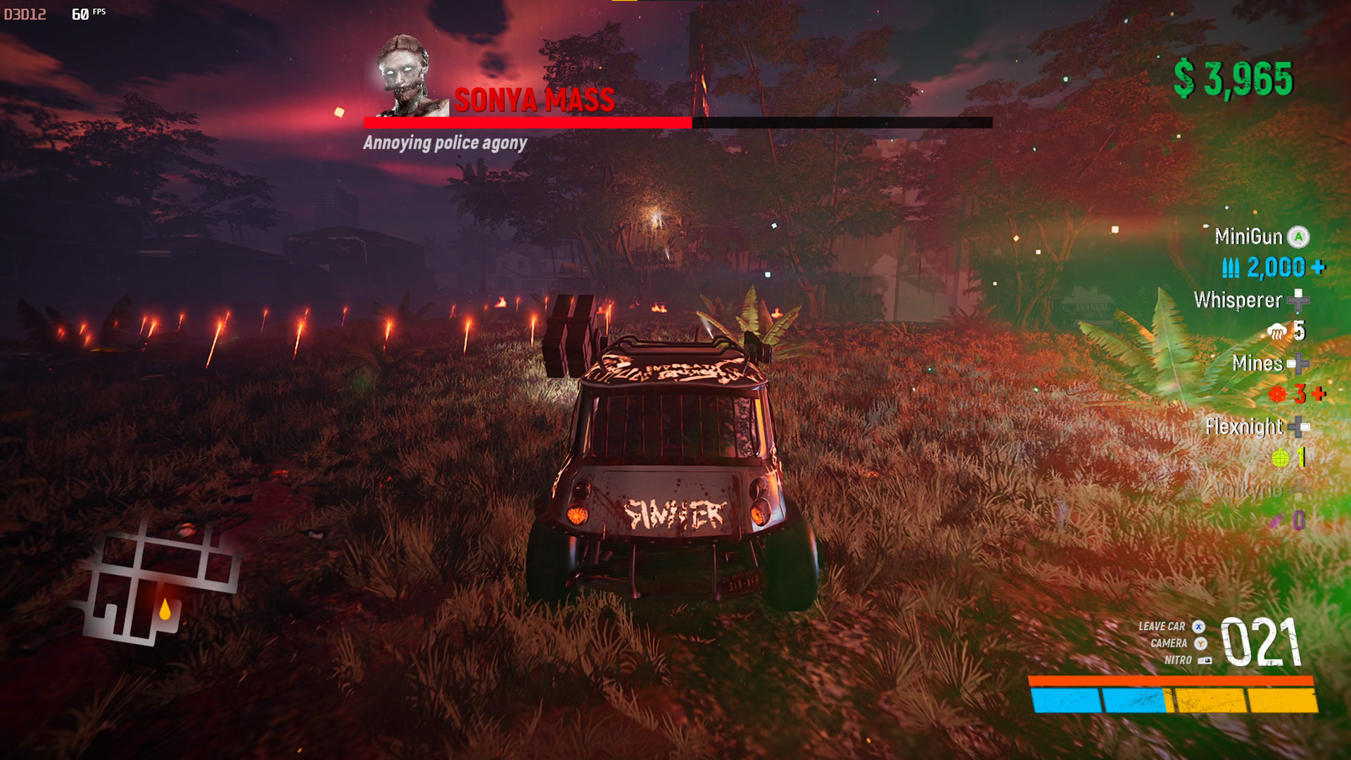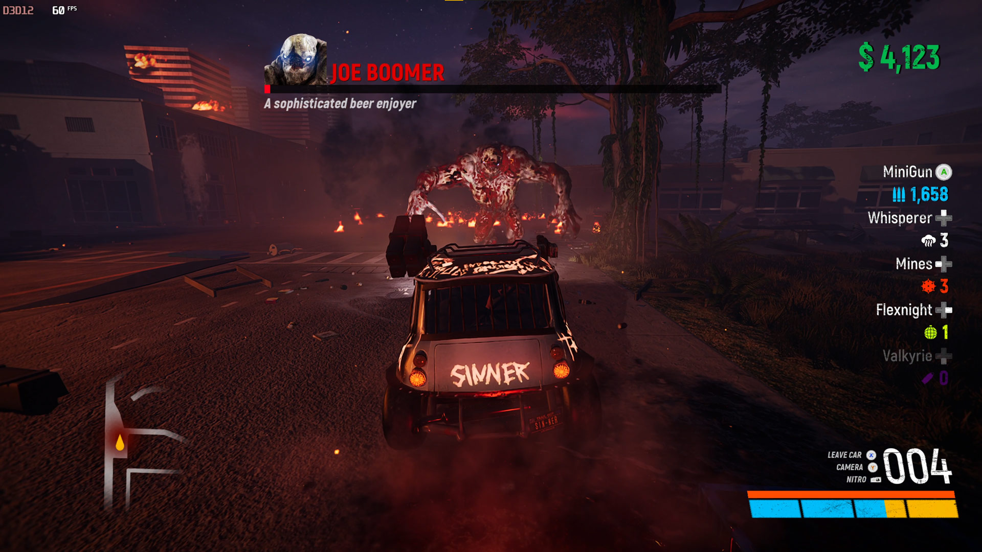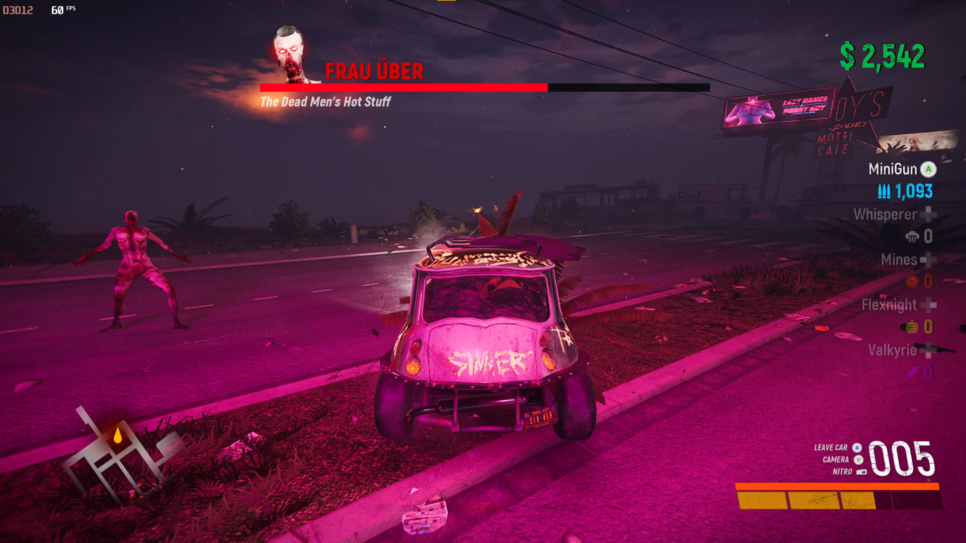 Now it is time for Frau Uber. In demonic form she or it likes to scream your face off and knock you from the car. But she also enjoys dancing so chuck Flexnights in her path and then blast those miniguns. Mines are good too as she runs towards you. Learn to save missiles for later.
